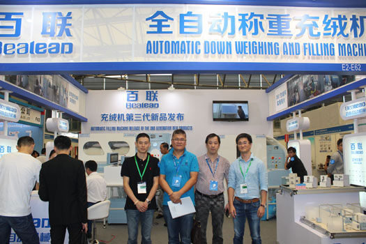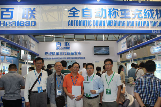 GM Wang: Bealead fully automatic down-filling machine fills down twice or three times faster than manual down-filling. The third generation fully automatic down-filling being exhibited on the exhibition is independently operated by two operators and no skill is required. Conservatively estimated, value produced by it will equal the value produced by manual work of 7-8 skilled workers. Non-contact weighing is adopted for the equipment and quantification will be more accurate. It is the most advanced product around the globe. The third generation Bealead down-filling machine (818B) has made many revolutionary breakthroughs in technology, such as 0.01 g grade maximum display precision control, automatic cyclic weighing by three weighing systems, synchronous data transmission and human-machine interaction system based on the Internet of things technology, intelligent automatic increase or reduction during operation and down changing by one key. Optimistically estimated, the equipment cost can be recovered within one year.