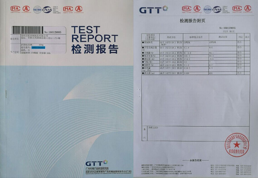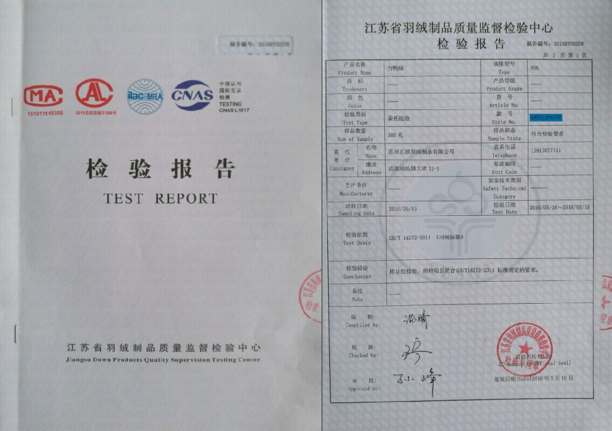 Bealead has entrust Jiangsu Feather Products Quality Supervision and Inspection Center, Guangzhou Fiber Product Testing Institute separately to have detection and write inspection reports. The goods can only be put in storage only two reports are qualified