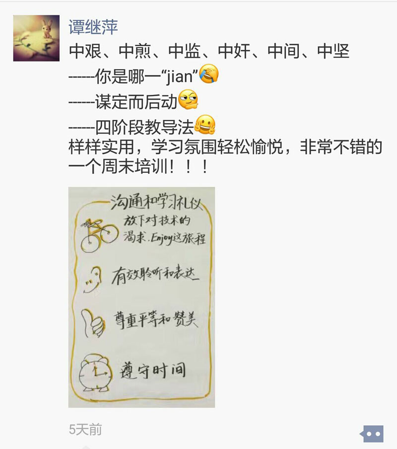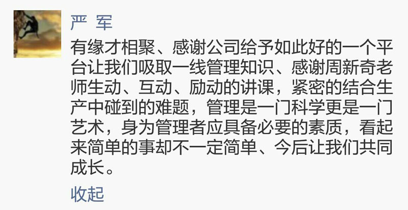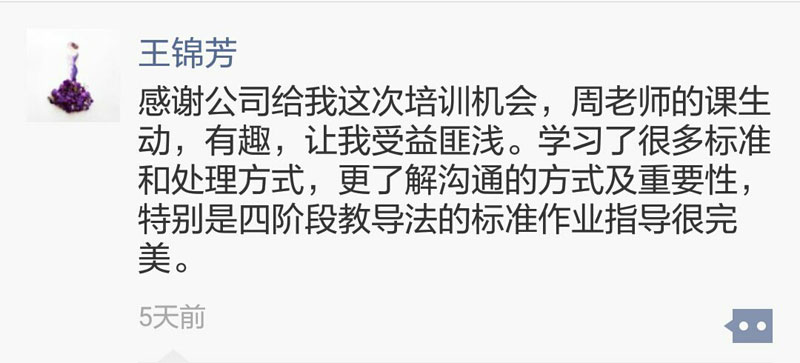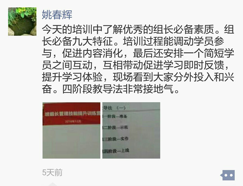 During the training, the first-line leaders are mainly intensifying skill training, and have new recognition in role cognition and team building, such as how to become the core force. By the local case, they get know of the four stages of teaching method, and also improve problem analysis and problem solving skills.