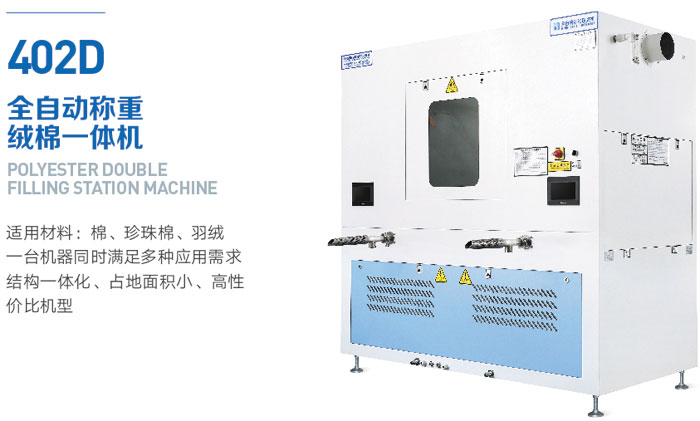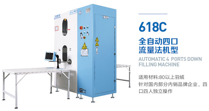 在雙口機型的基礎上升級成四口流量法機型,適用80-90g羽絨,填充范圍0.2-3g,主要針對國內部分內銷品牌企業(yè)的應用需求。