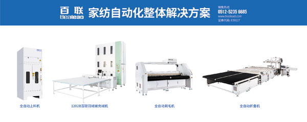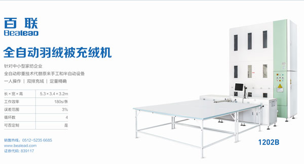 今年以來,百聯整合家紡自動化產品資源,針對羽絨被、枕頭、靠墊等家紡產品的應用需求,推出了可個性化定制的家紡充填類自動化整體解決方案。這些產品主要涉及全自動上料機、羽絨被充絨機、被子折疊機、打包機等,形成了完整的家紡自動化流水線,幫助客戶企業提高生產效率、降低人力成本、提高產品質量,為實現“智能工廠”及“智能生產”提供了有力的保障。